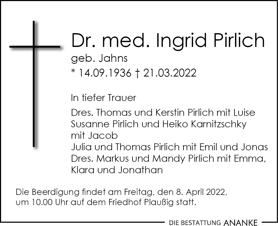 Gedenkseite - Dr. med. <br/> Ingrid Pirlich
