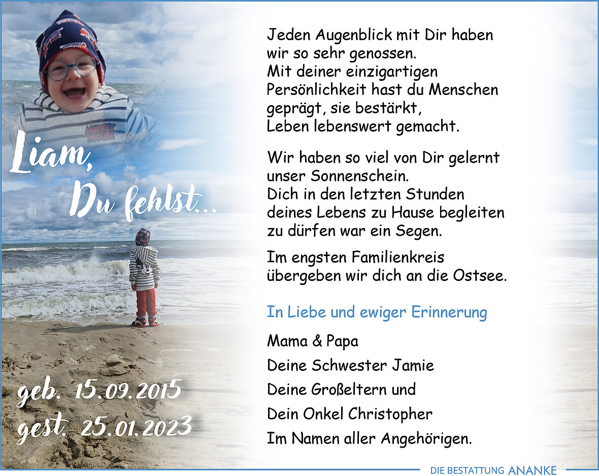 "Mein kleiner „großer“ Kumpel Liam, es gibt keine passenden Worte, es vergeht kein Tag an dem wir nicht an dich denken, mit jeder Erinnerung lebst du weiter, wir lassen dich Fliegen, so hoch und weit du es verdient hast.