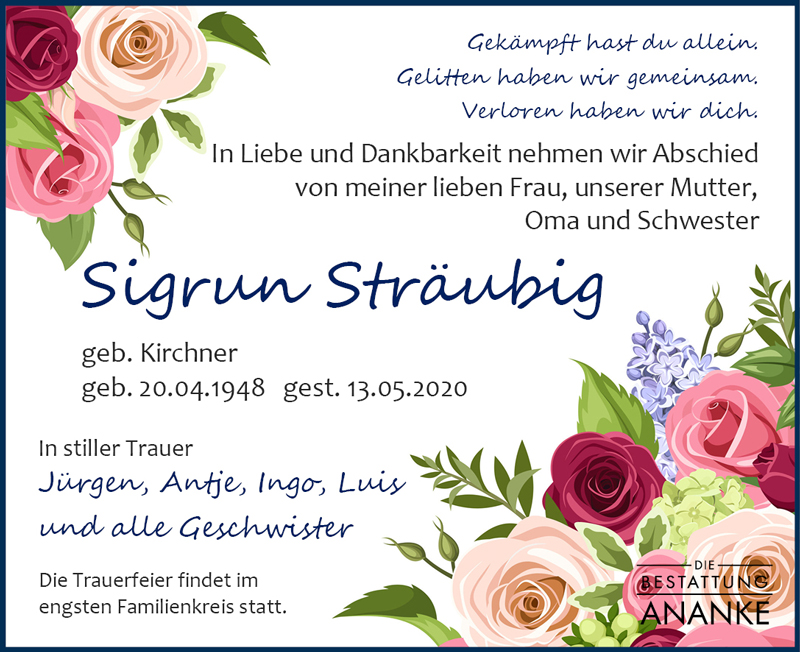 Ich danke Frau Sträubig für die vielen wunderbaren Jahre, ihr stets offenes Ohr und für ihre einzigartige einfühlsame Art.