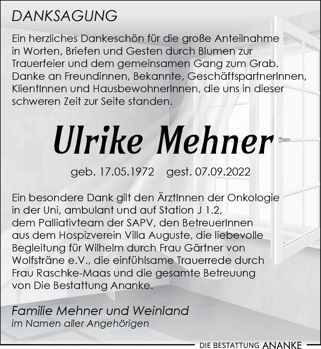 wir haben bei unserem Treffen heute Abend ein schwerwiegendes Ereignis vermutet und es ist Gewissheit geworden. Wir können es nicht fassen, dass Eure liebenswerte und lebensfrohe Frau und Mutti nicht mehr bei uns allen ist. Wir wünschen Euch die Kraft, die Ihr jetzt braucht. Lieber Wilhelm, ich freue mich, wenn ich Dich etwas aufmuntern kann. Komm zu mir, wenn Du Zeit hast. Dein Freund Felix, Mama Manuela und Papa Jürgen